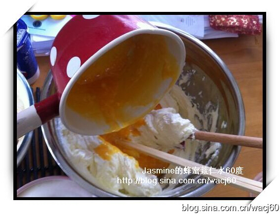 6.將冷卻的蛋黃液倒入上面的混合液中,攪拌均勻