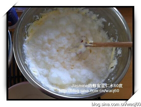 7.將打發(fā)的蛋白液倒入軟化的馬斯卡彭芝士中,攪拌均勻