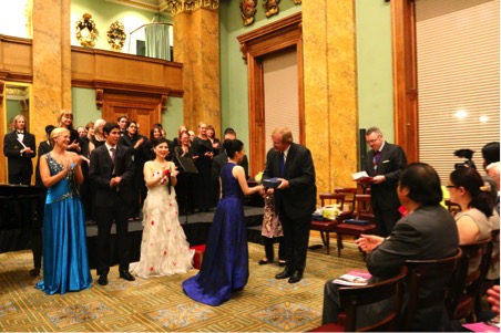 大衛(wèi)·伍頓爵士是金融城同業(yè)俱樂部(city livery club)的主席,也是2011-2012年度倫敦金融城的市長和旨在表彰全球優(yōu)秀華人女性的木蘭獎、木蘭基金會網(wǎng)絡(luò)(The Mulan Foundation Network)的大使。而黎美嬋女士則是代表女王進行活動的女王副官。而在這樣一場中西音樂交流的盛會上,第一個演出的藝術(shù)家,是來自中國香港的“鋼琴公主”黃子芳。