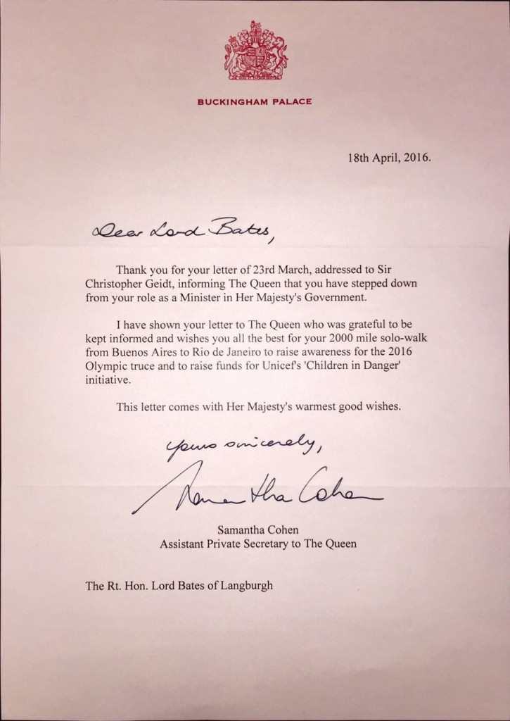 我已經(jīng)將您的信呈交女王陛下閱覽,她對(duì)您的來(lái)信表示衷心感謝。得知為了宣傳奧林匹克休戰(zhàn)精神,以及為聯(lián)合國(guó)兒童基金會(huì)籌款以幫助戰(zhàn)火中的兒童,您將從布宜諾斯艾利斯單人徒步到里約熱內(nèi)盧,全程2,000英里(3,000公里),女王陛下借此信祝您一切順利。